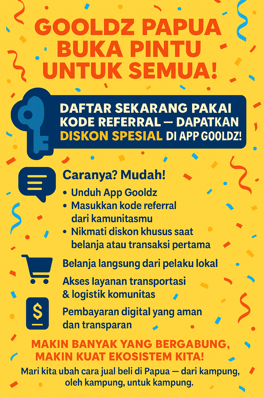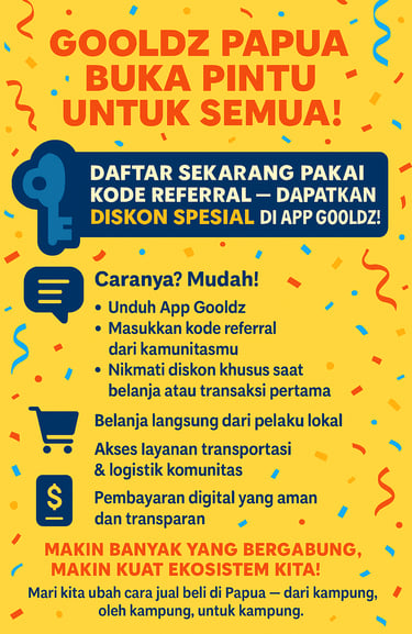 Gooldz Papua adalah platform digital yang sesuai untuk masyarakat Papua, memberikan solusi dalam jual beli, logistik, dan layanan komunitas. Dengan semakin berkembangnya teknologi, Gooldz hadir untuk mendukung petani, pelaku UMKM, kepala dusun, driver, dan pengguna lainnya dalam memaksimalkan potensi ekonomi lokal. Salah satu pembaruan yang sangat dinanti adalah fitur referral yang membuka pendaftaran untuk publik.